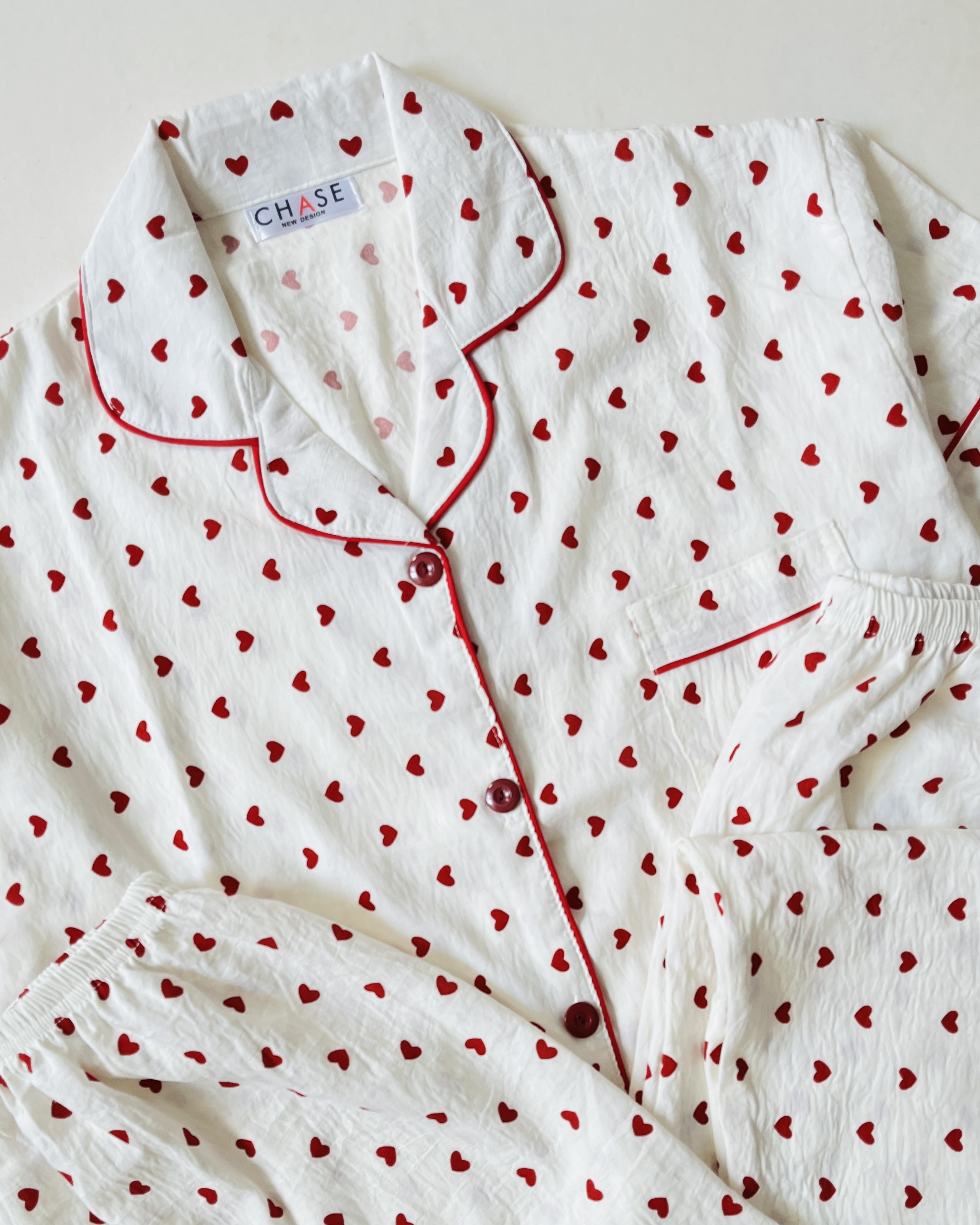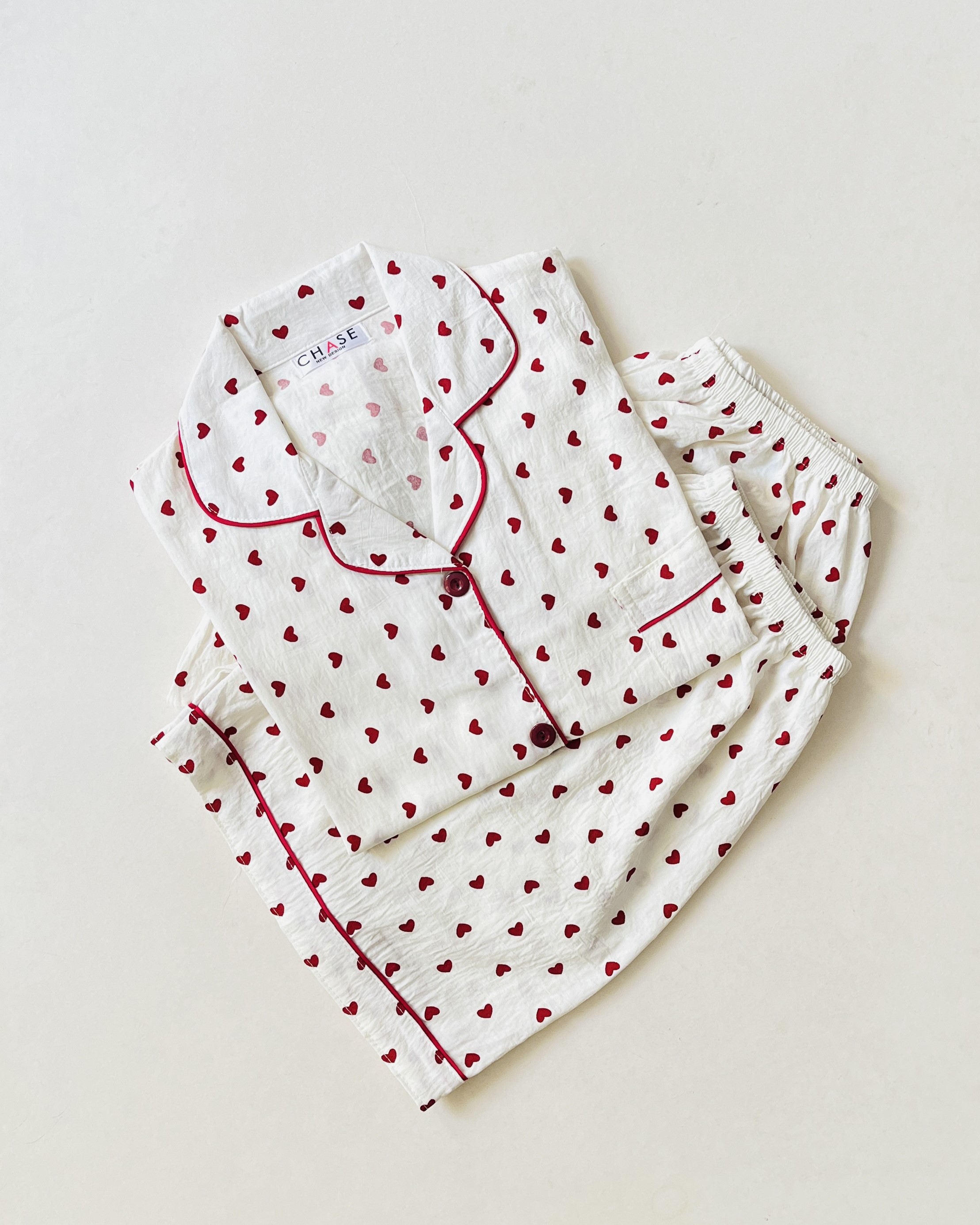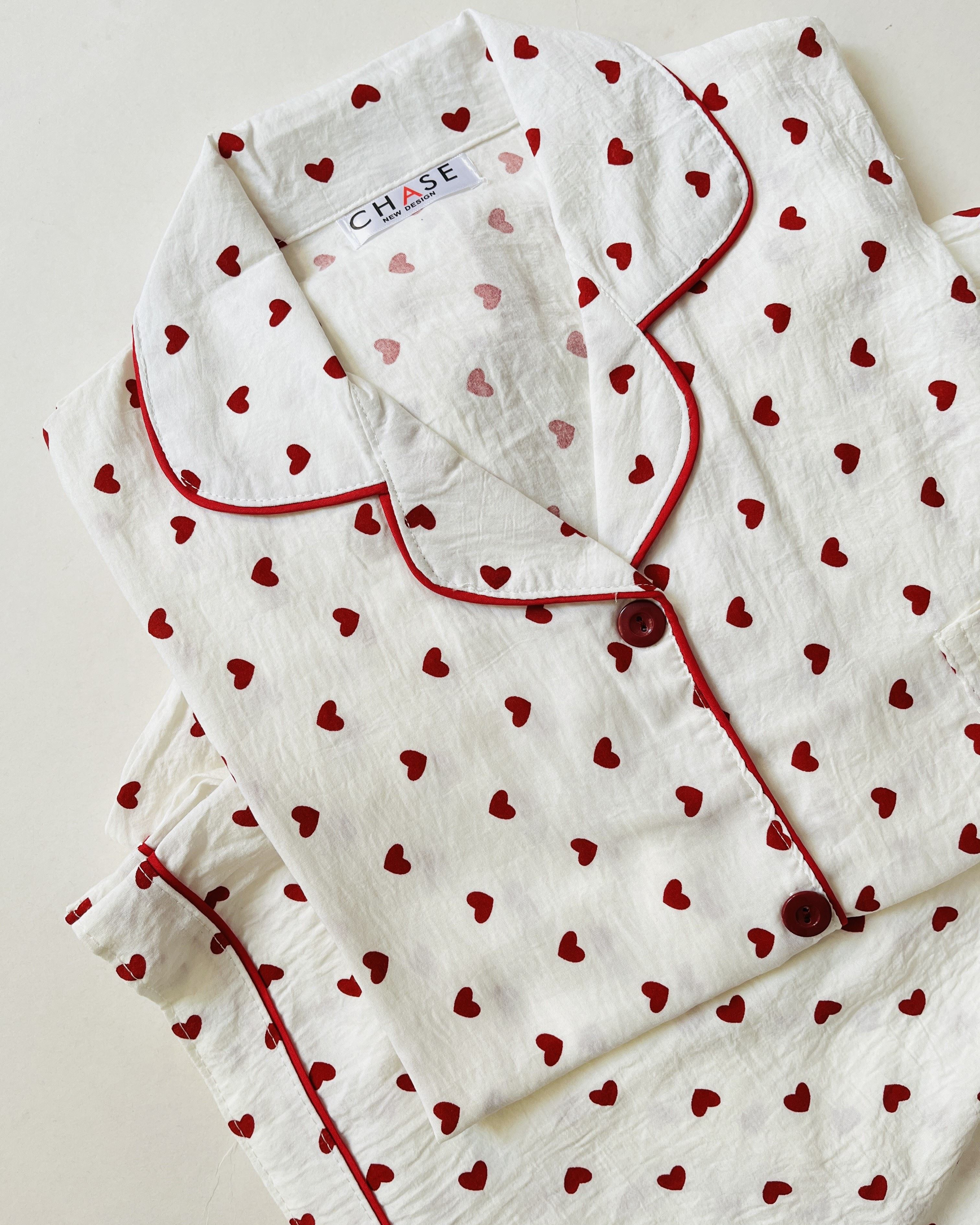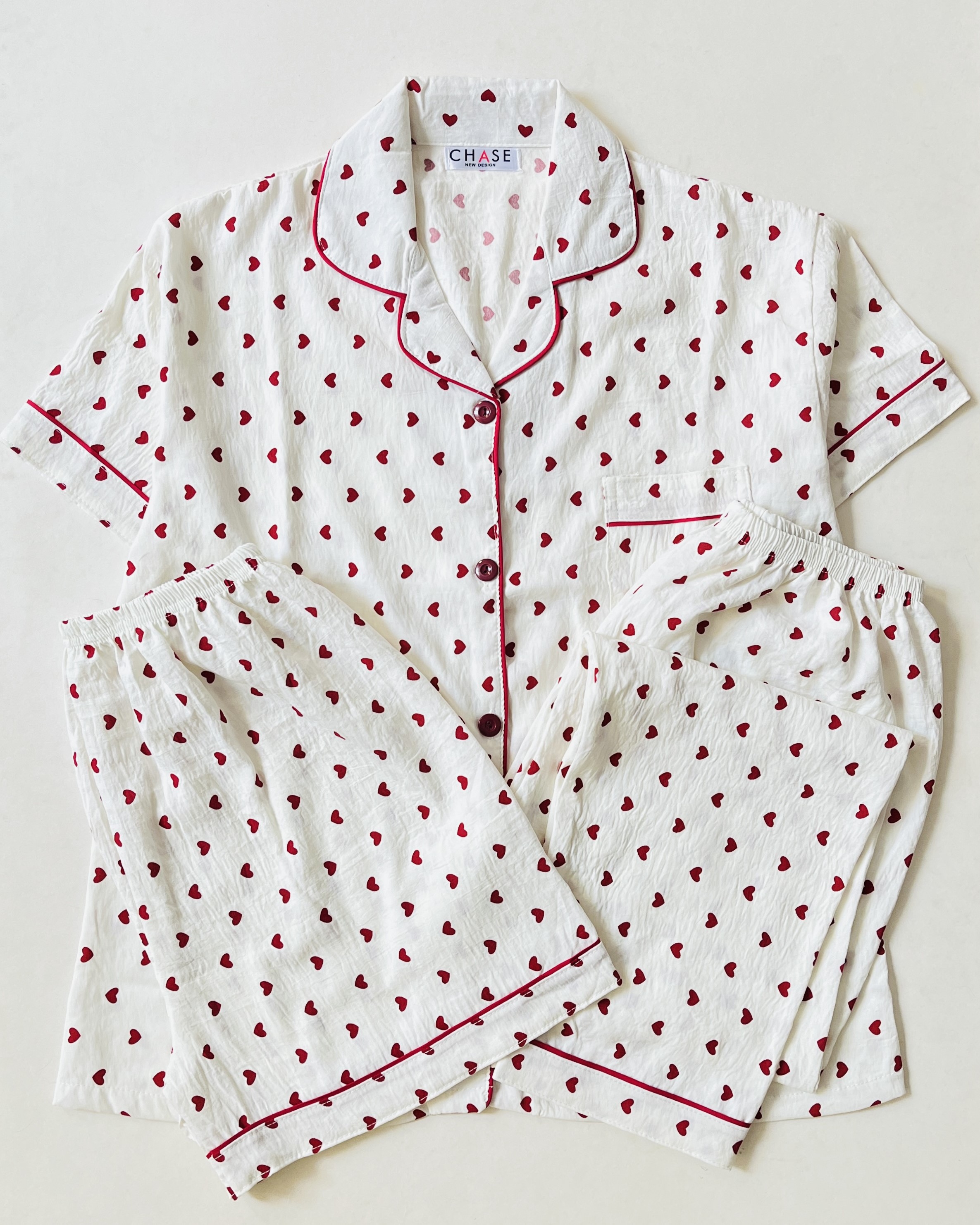 ست سه تیکه بلوز، شلوار و شلوارک نخ موسلین آستین کوتاه قلب قرمز- کد N14