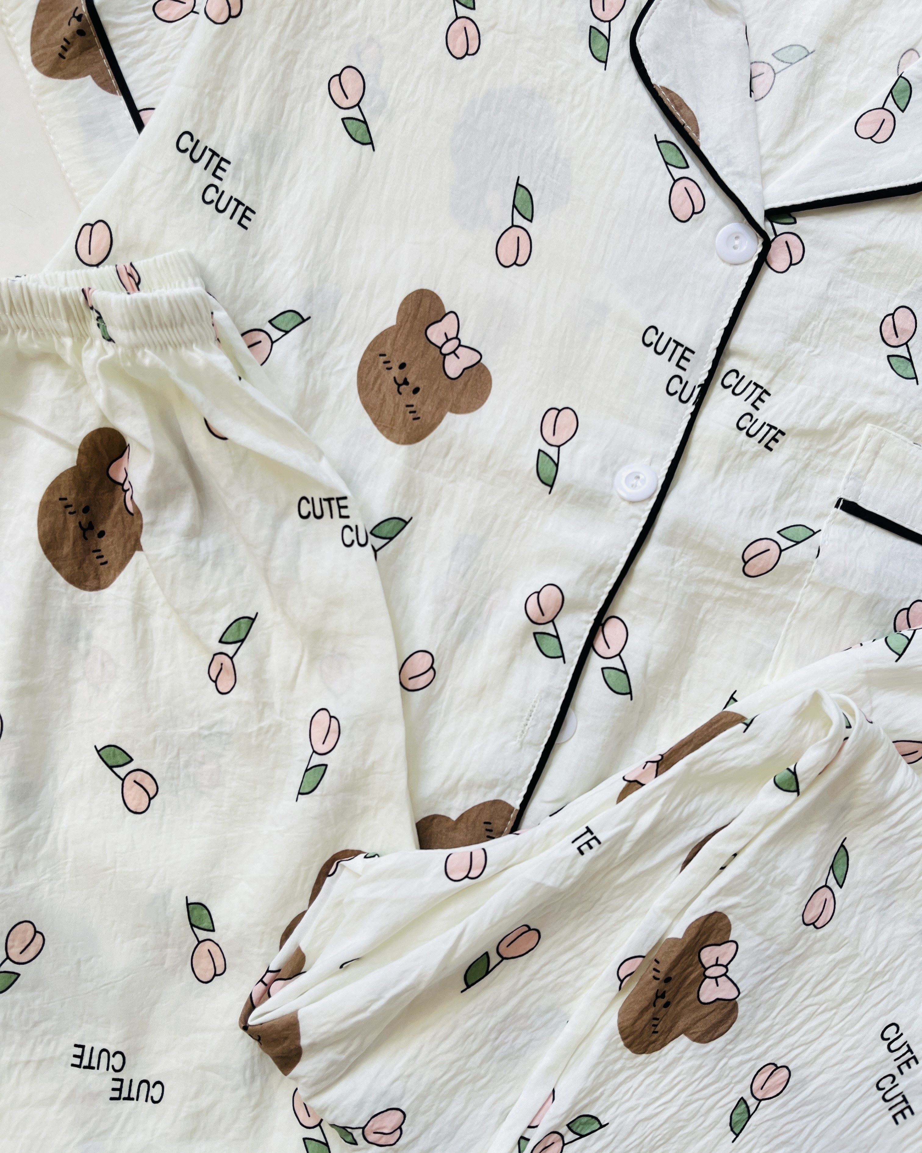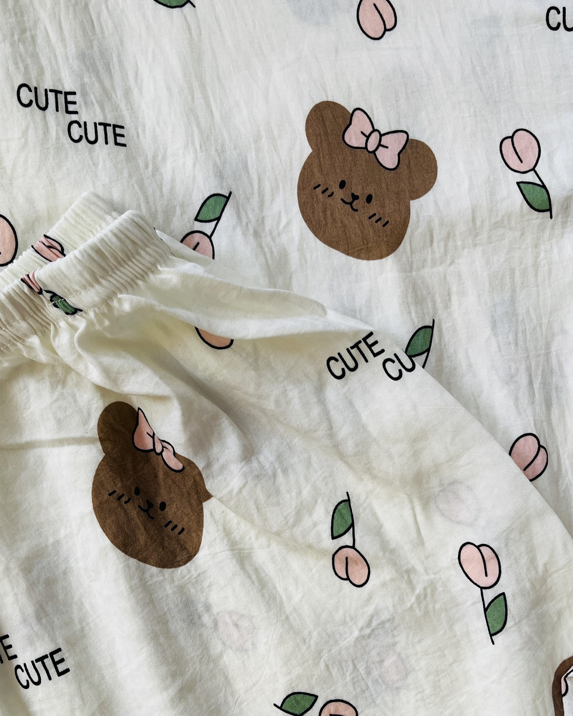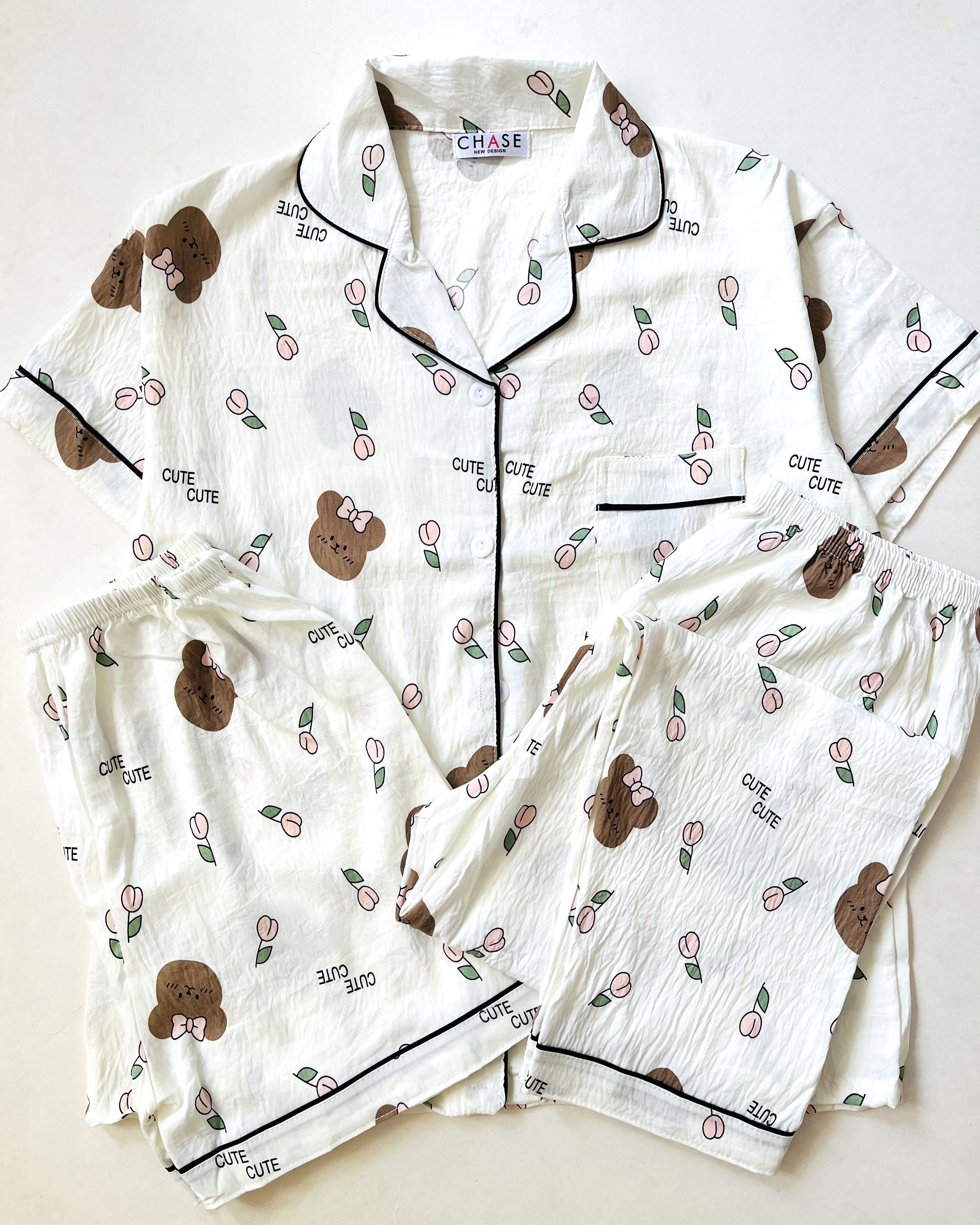 ست سه تیکه بلوز، شلوار و شلوارک نخ موسلین آستین کوتاه خرس قهوه ای و گل- کد N14