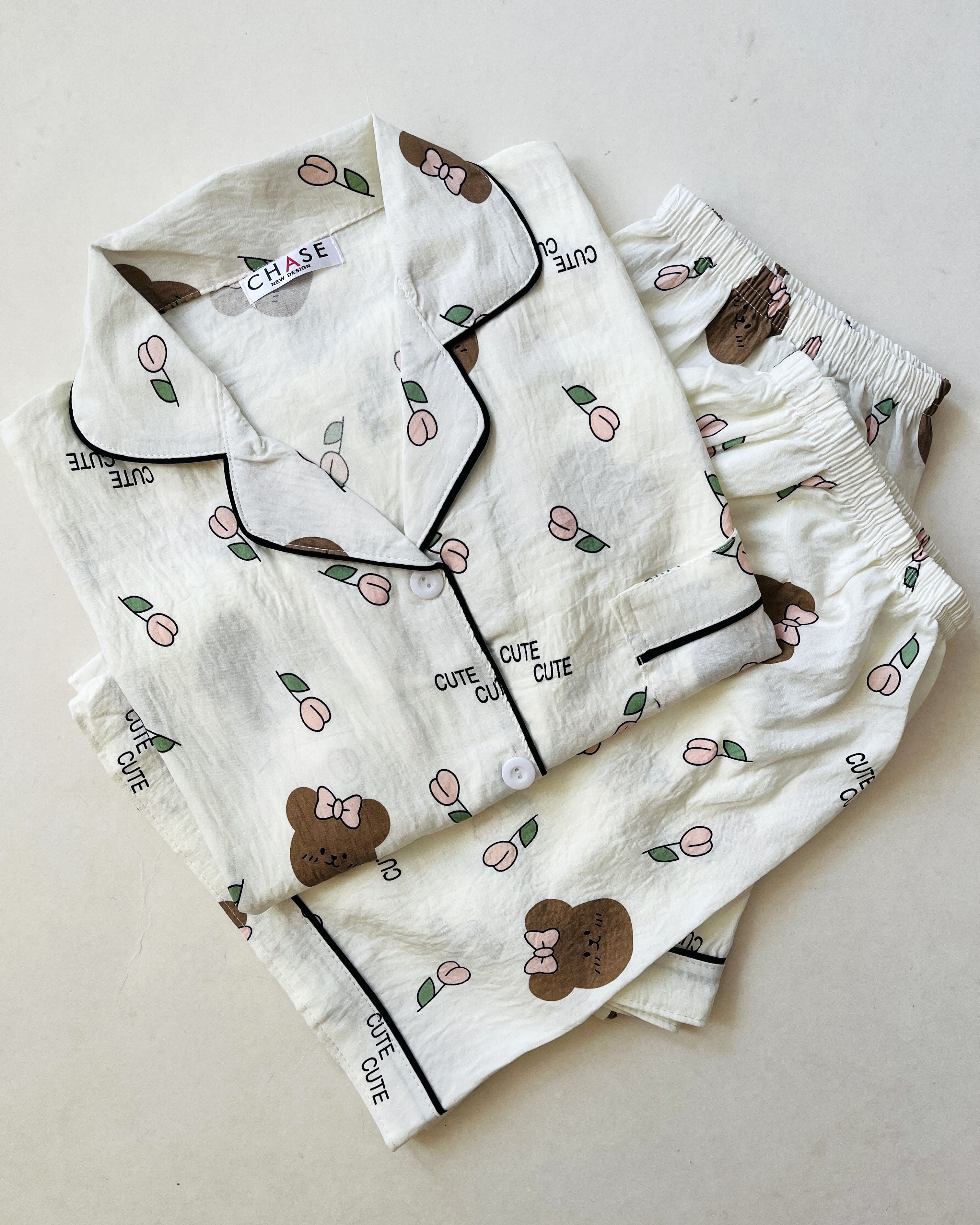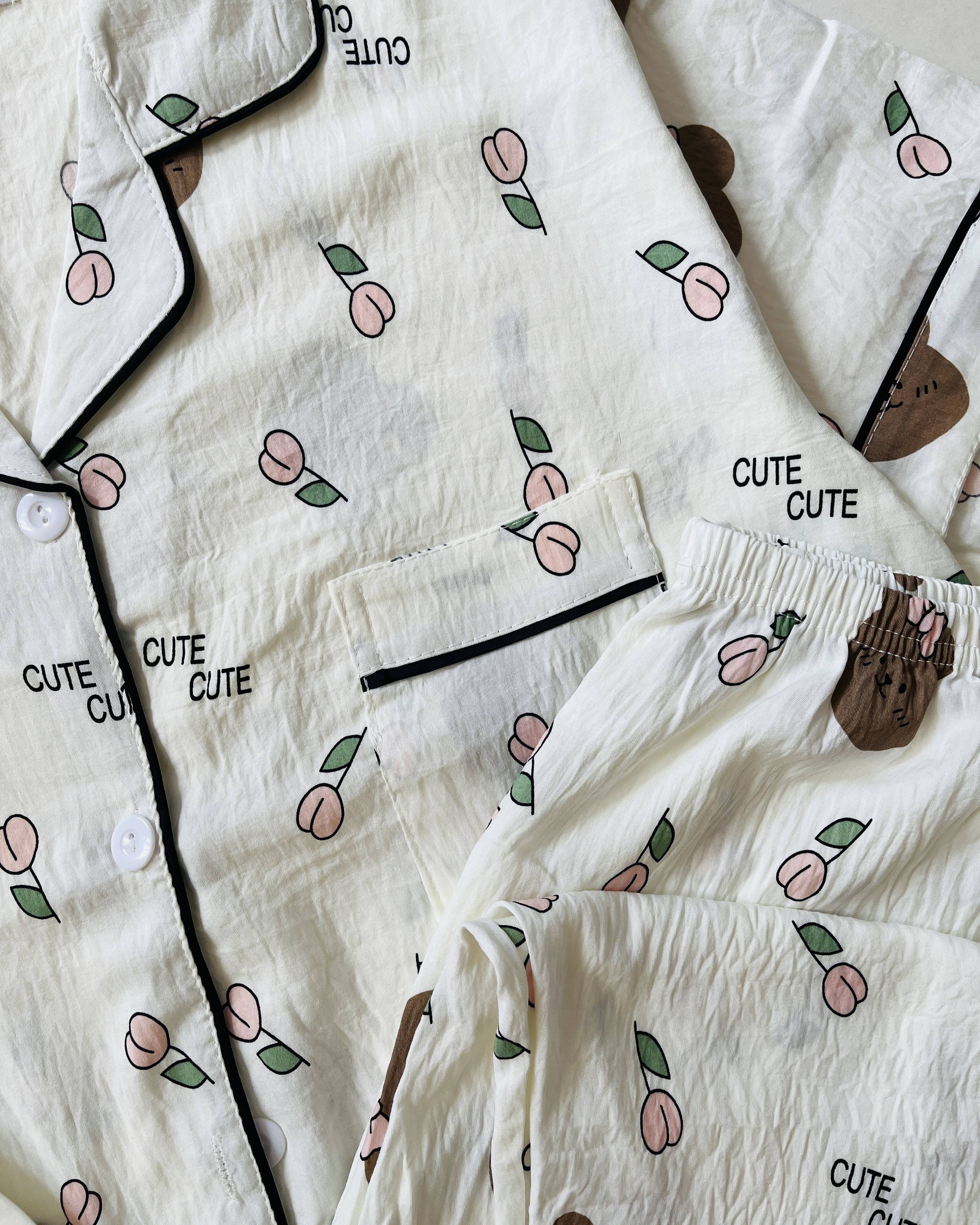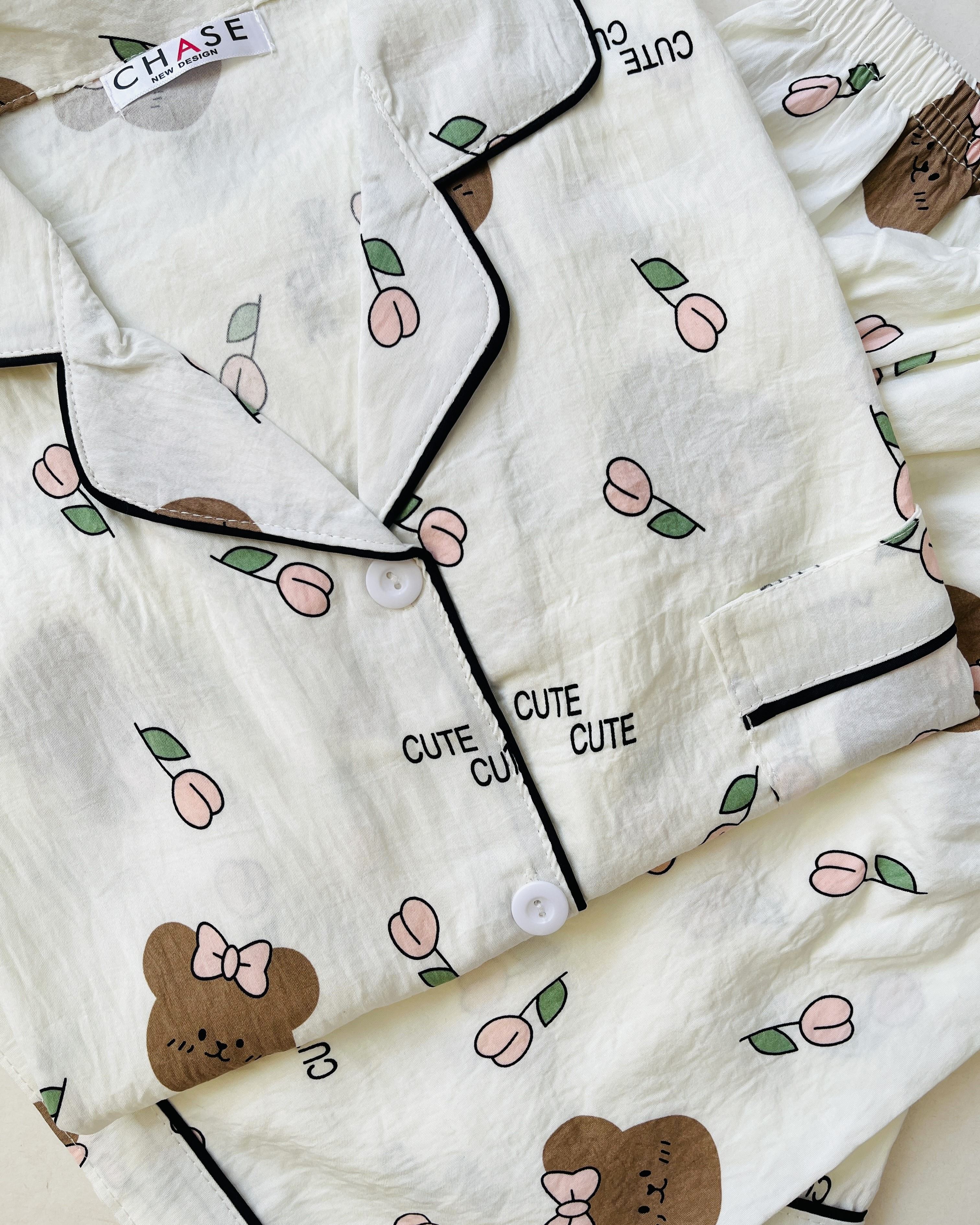 ست سه تیکه بلوز، شلوار و شلوارک نخ موسلین آستین کوتاه خرس قهوه ای و گل- کد N14